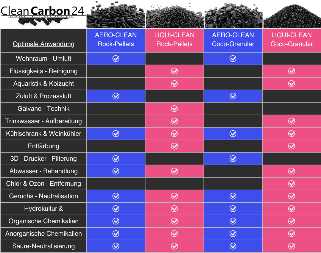 Wähle deinen Einsatzbereich und finde die passende Aktivkohle in Sekunden.